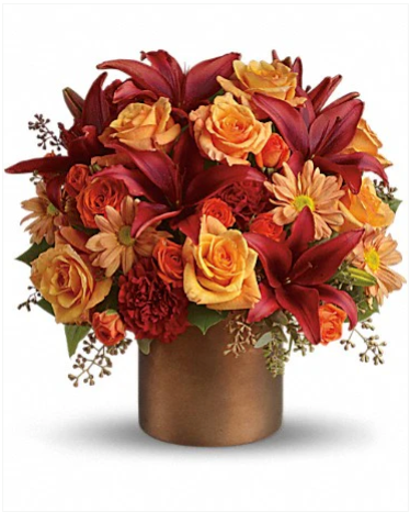 Autumn is an awesome season and it's meant to be celebrated in style. Rich fall hues are on brilliant display in this beautiful arrangement that comes delivered in an elegant satiny brown cylinder vase.